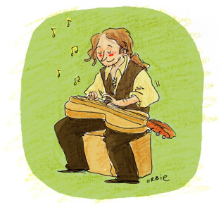 un petit dessin pour les Cartonfolies de Cabano représentant l’activité « Carton folks » (des spectacles avec des instruments en carton, ainsi que des atelier de conception de guitares en carton)
