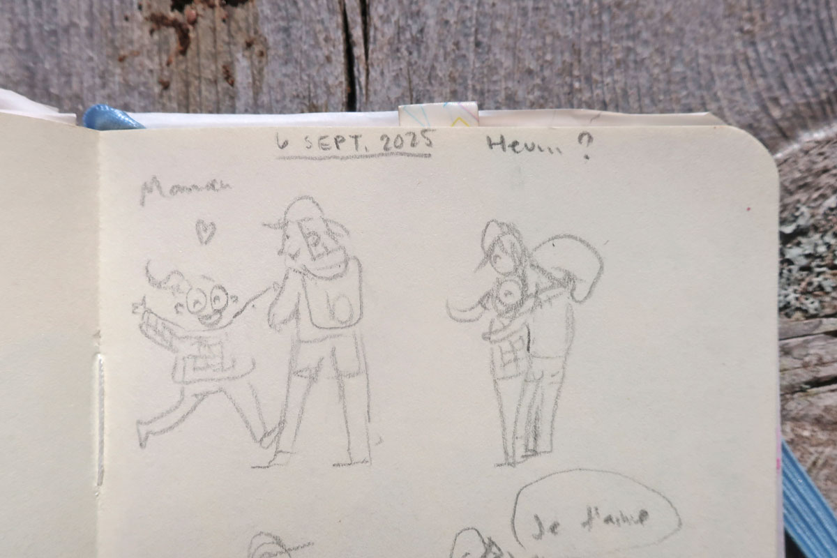 Amqui.22 août 2025 Petite BD notée, dans mon cahier d’écriture.C’est pas une vraie BD de famille, mais je la dépose à leurs côtés, car c’est dans le même esprit ;)… Read More →