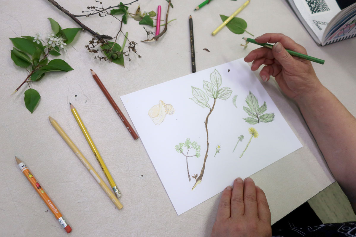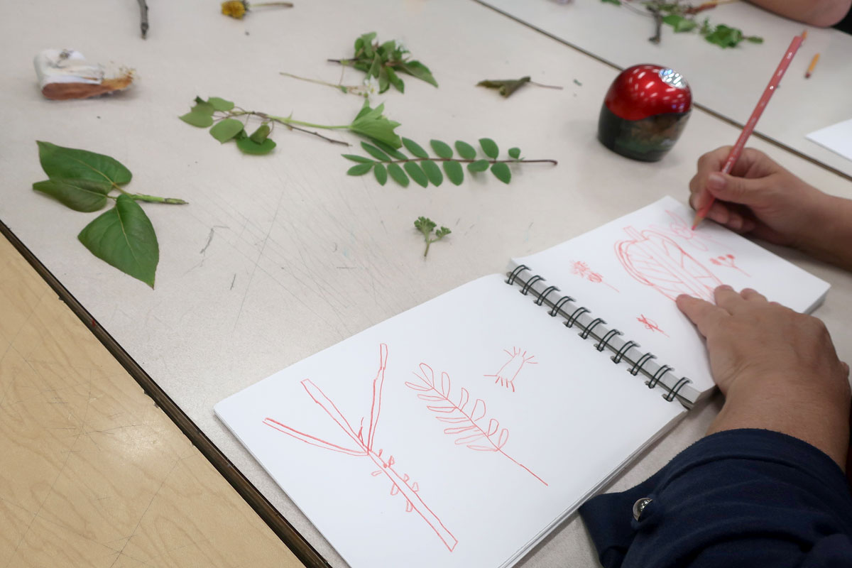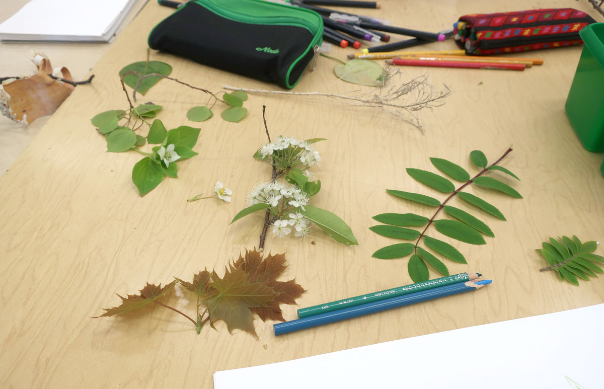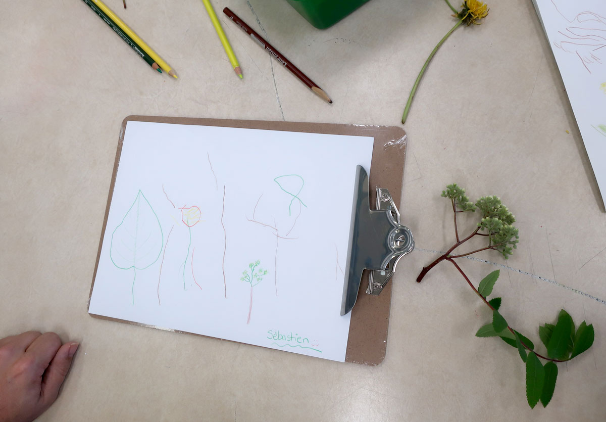 On est sortis dehors, cueillir des éléments de la nature (fleurs séchées, pissenlits, branches de saules, cocottes). On a ramené ça en classe, sur les bureaux, pour s’amuser à les dessiner.