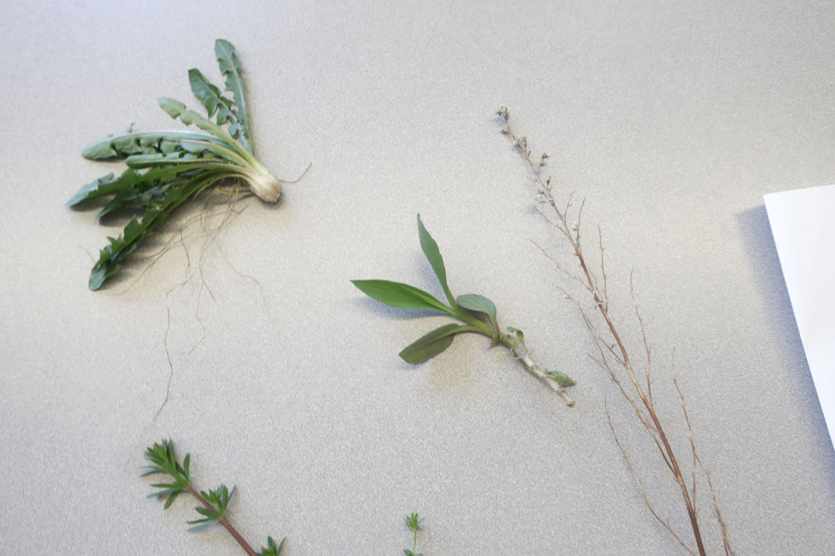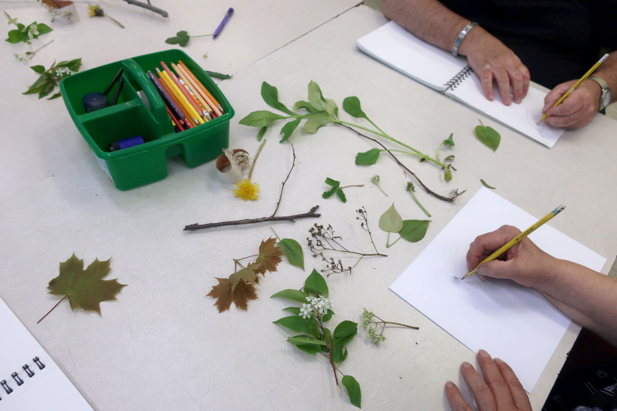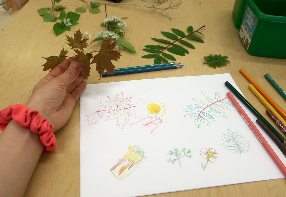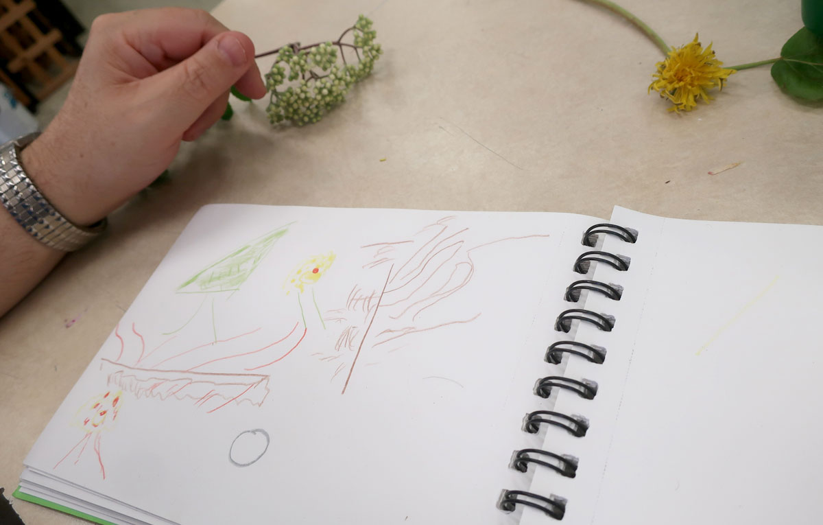 On est sortis dehors, cueillir des éléments de la nature (fleurs séchées, pissenlits, branches de saules, cocottes). On a ramené ça en classe, sur les bureaux, pour s’amuser à les dessiner.