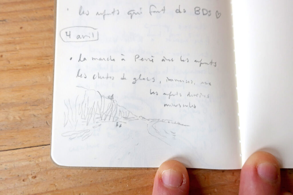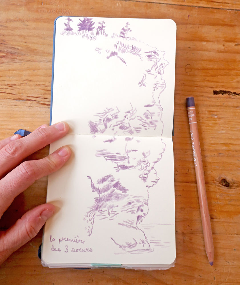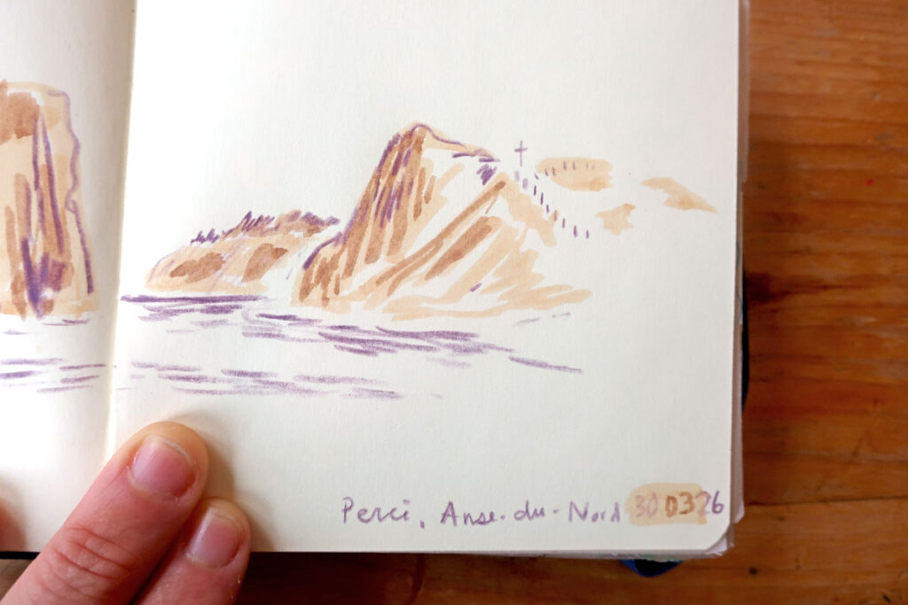 On a pris un petit moment pour dessiner, au travers des banquises échouées sur la plage de l’Anse-du-Nord. Un peu froid pour les mains et les fesses, mais awwww, c’est tellement un beau point de vue sur le rocher et les falaises.