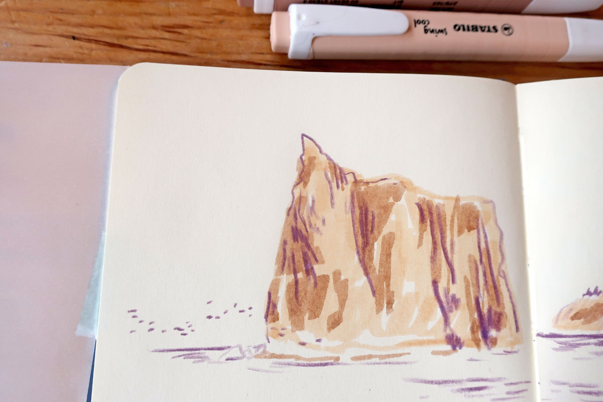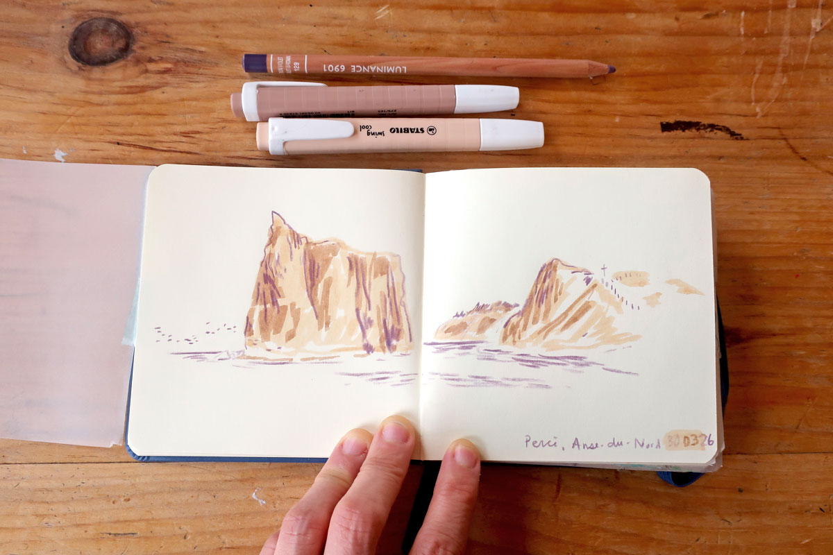 On a pris un petit moment pour dessiner, au travers des banquises échouées sur la plage de l’Anse-du-Nord. Un peu froid pour les mains et les fesses, mais awwww, c’est tellement un beau point de vue sur le rocher et les falaises.