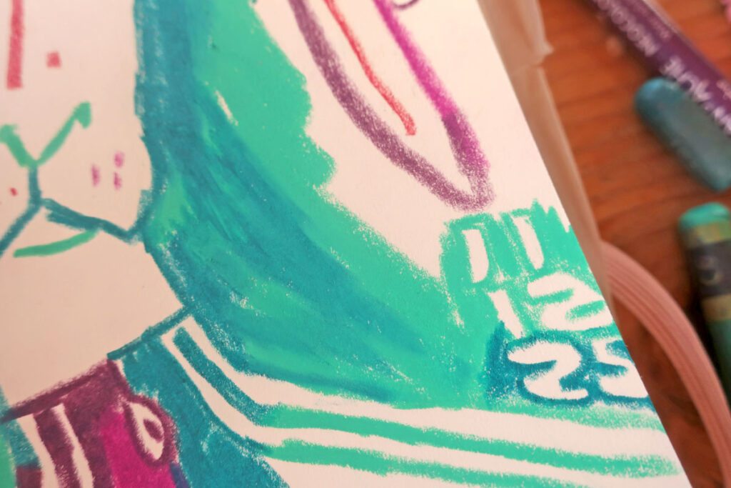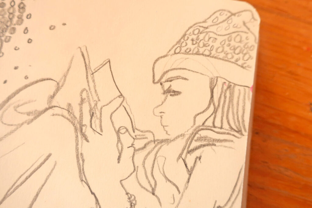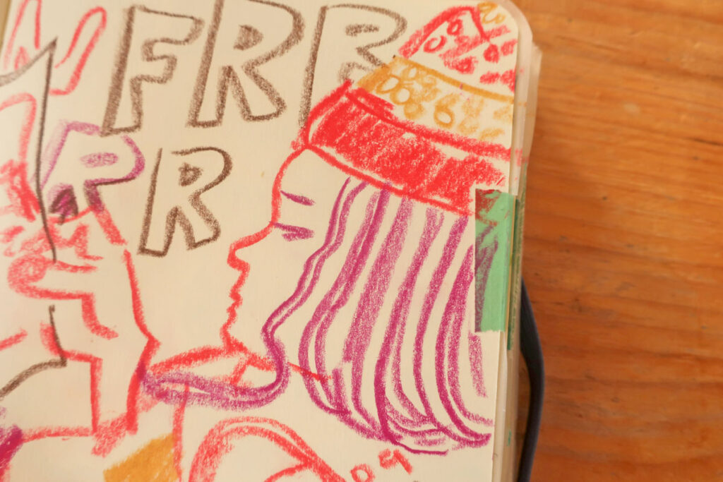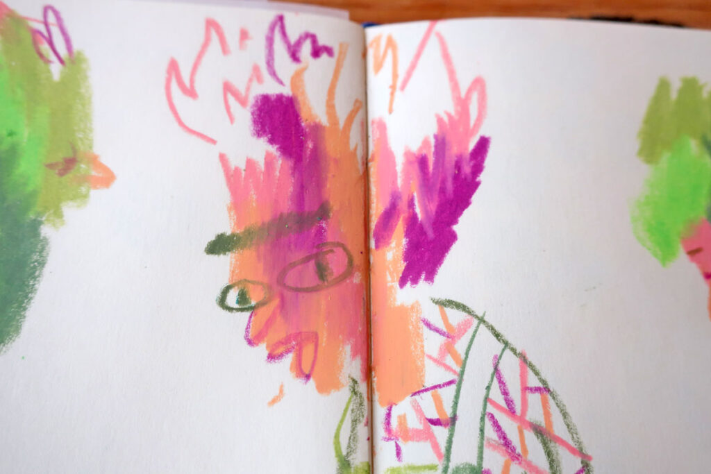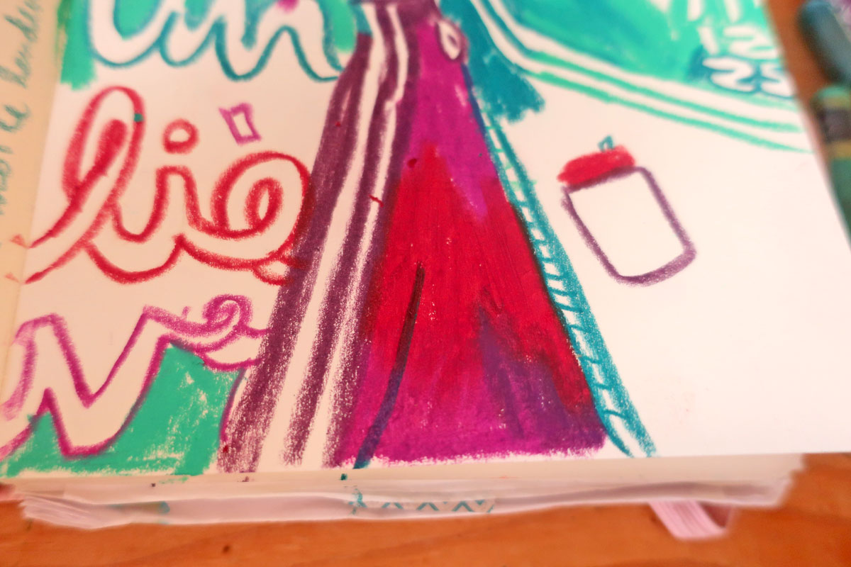 Dans mon exemple, plus haut, j’ai commencé par juste des gribouillis et ça a fait les cheveux de la dame de droite.