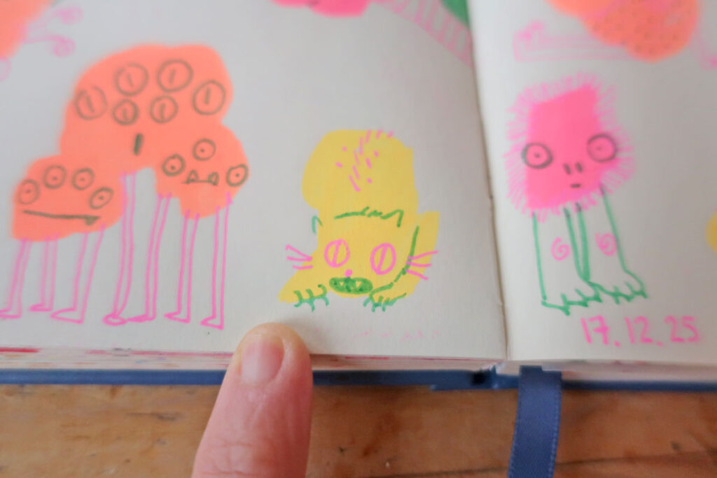 Puis d’autres gribouillis, à gauche, m’ont suggéré un monstre, que j’ai complété.