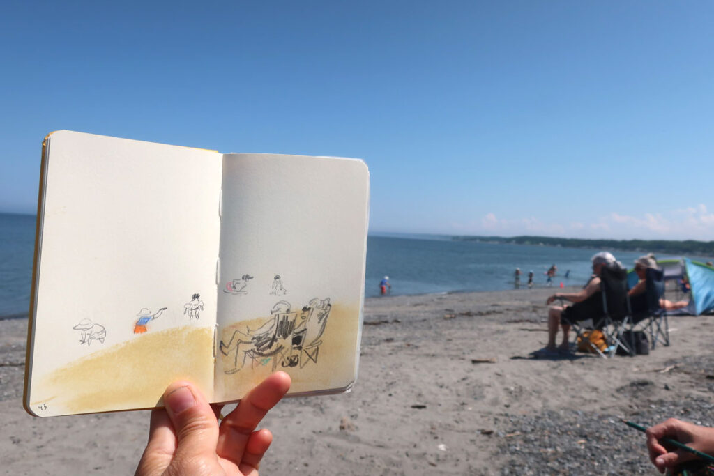 Janou-Eve et moi, on a profité de notre relative proximité géographique( 2h plutôt que 12h), pendant nos vacances pour s’évader quelques heures de nos familles et se rejoindre, à mi-chemin, à Ste-Luce-sur-Mer pour aller dessiner (et jaser) ensemble à la plage :D