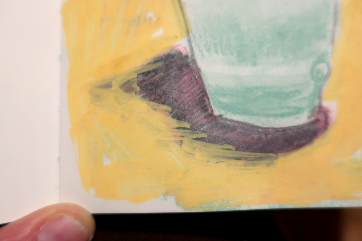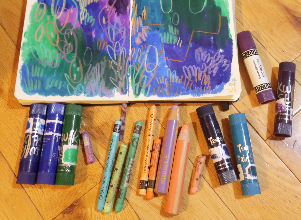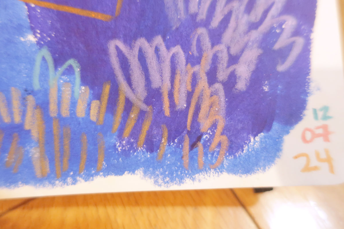Et je montre les Nupastels (pastels secs) à Janou qui se demande comment je les utilise. Je lui montre vite vite que je les utilise parfois surtout pour faire des fonds (je les utilise rarement pour autre chose, c’est quand même salissant et je trouve ça tannant, mais c’est cool pour couvrir de quoi de grand, faire du flou et EFFACER).