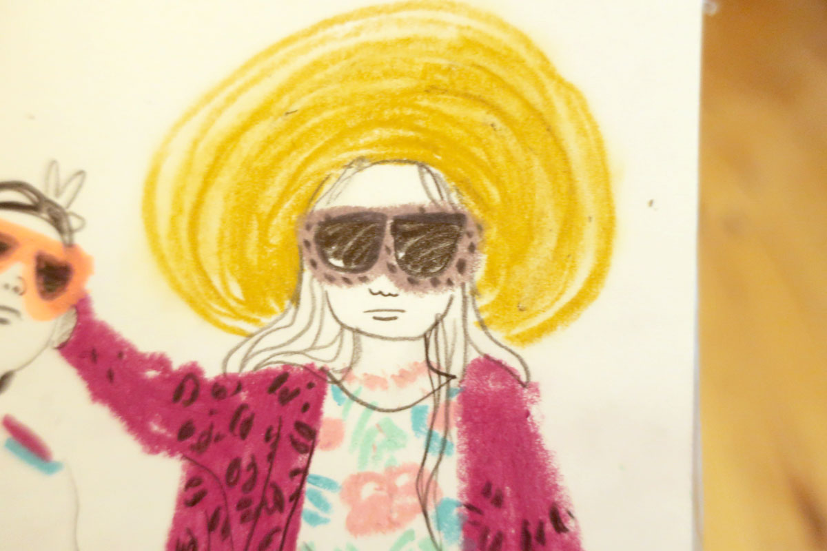 Fait avec un crayon de plomb, un feutre-pinceau beige-rosé et un souligneur beige.