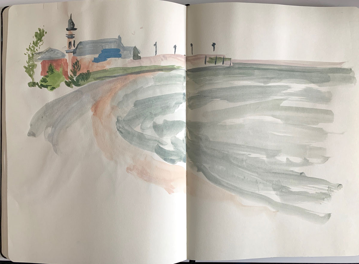 Je me vire de bord et prends l’église et la maison bleue, au loin, comme modèle.