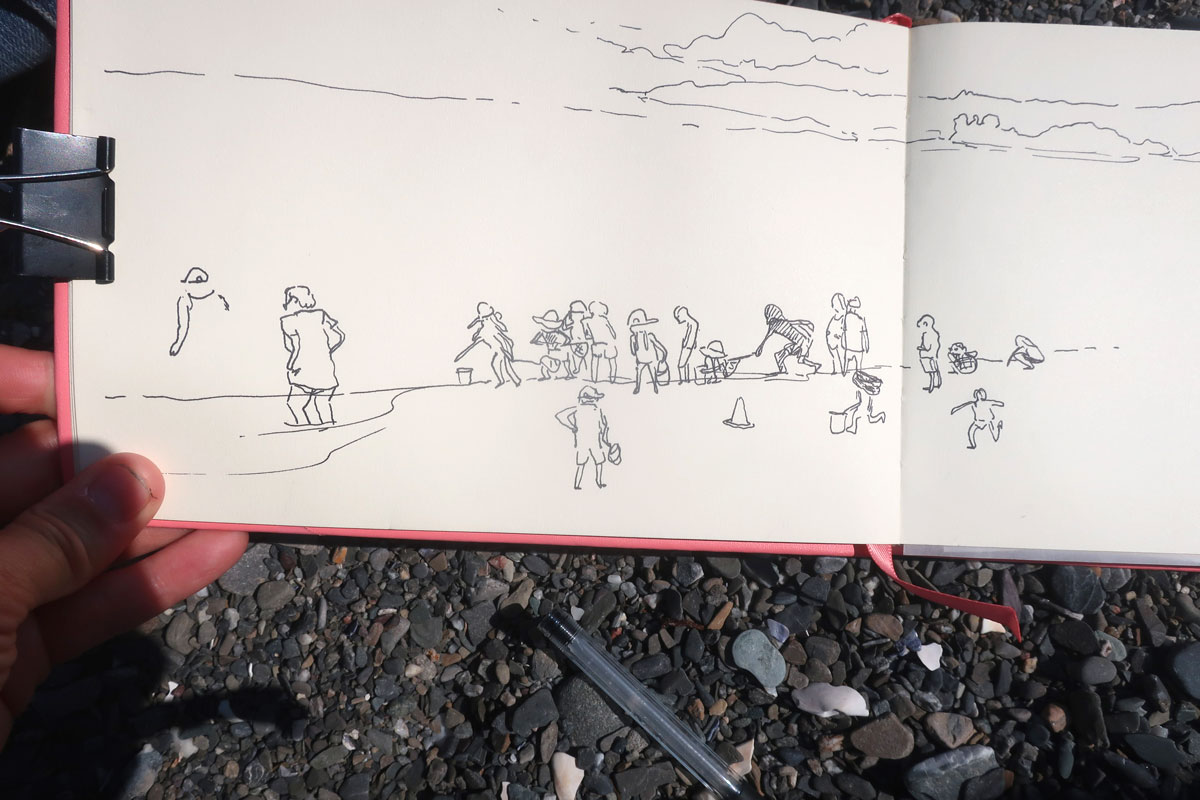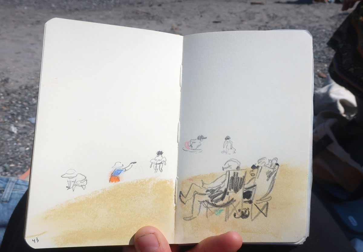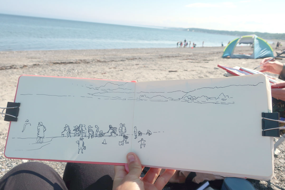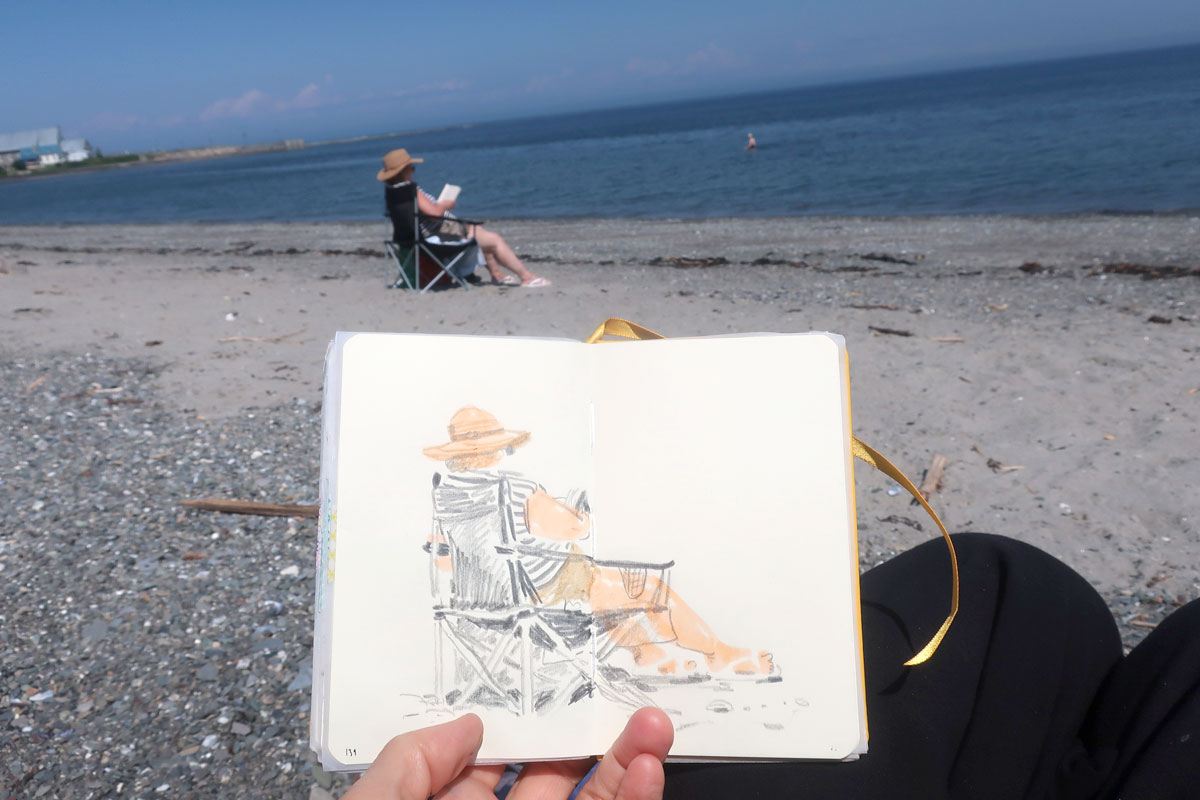 Janou-Eve et moi, on a profité de notre relative proximité géographique( 2h plutôt que 12h), pendant nos vacances pour s’évader quelques heures de nos familles et se rejoindre, à mi-chemin, à Ste-Luce-sur-Mer pour aller dessiner (et jaser) ensemble à la plage :D