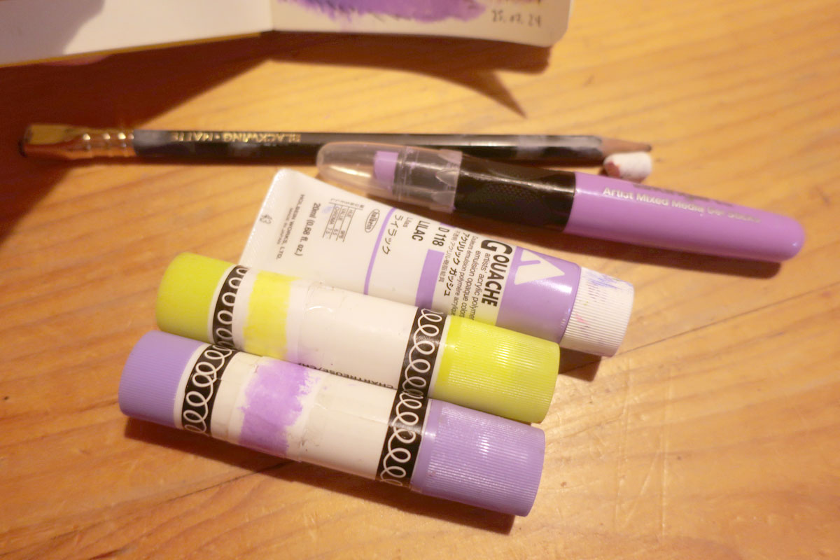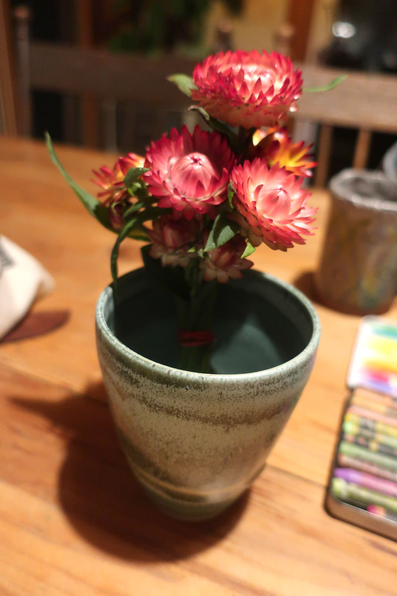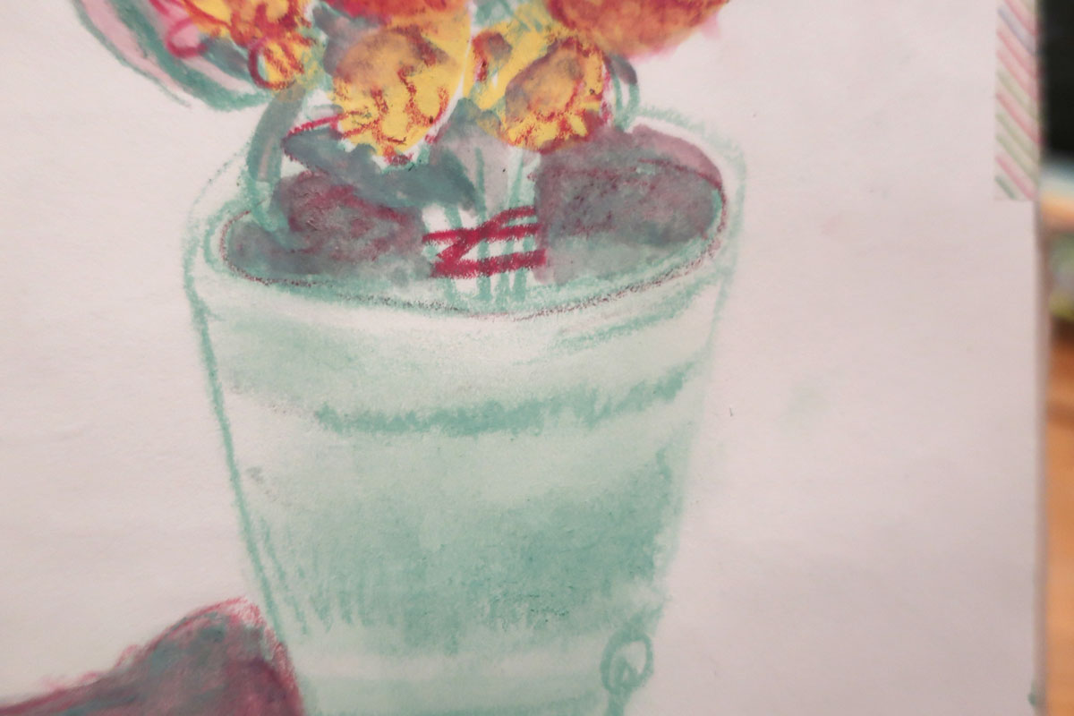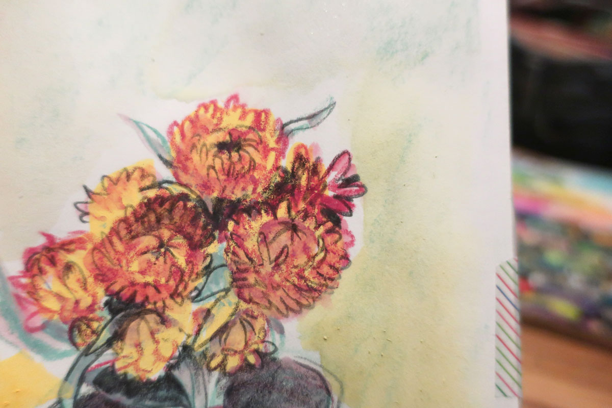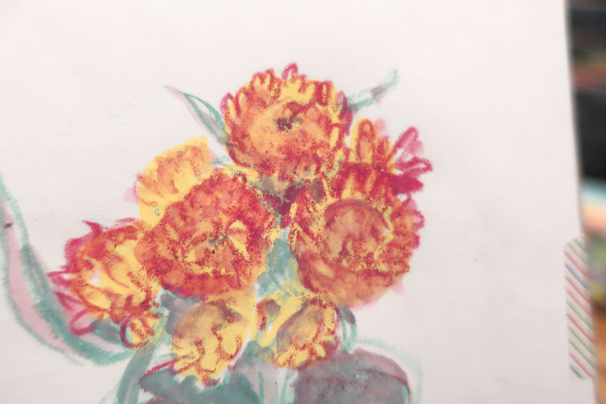 C’est déjà pas facile, faire un bouquet et en plus, je me rajoute la contrainte de seulement utiliser 3 médiums/couleurs, dont l’un qui est un pastel sec (que j’utilise pas souvent)