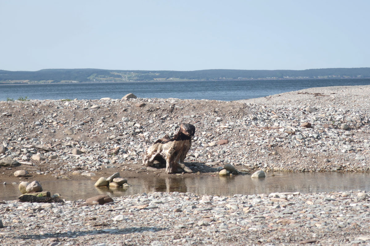 Sur la plage, une vieille souche d’arbre, polie par la mer, puis brûlée sommairement, par des vacanciers.