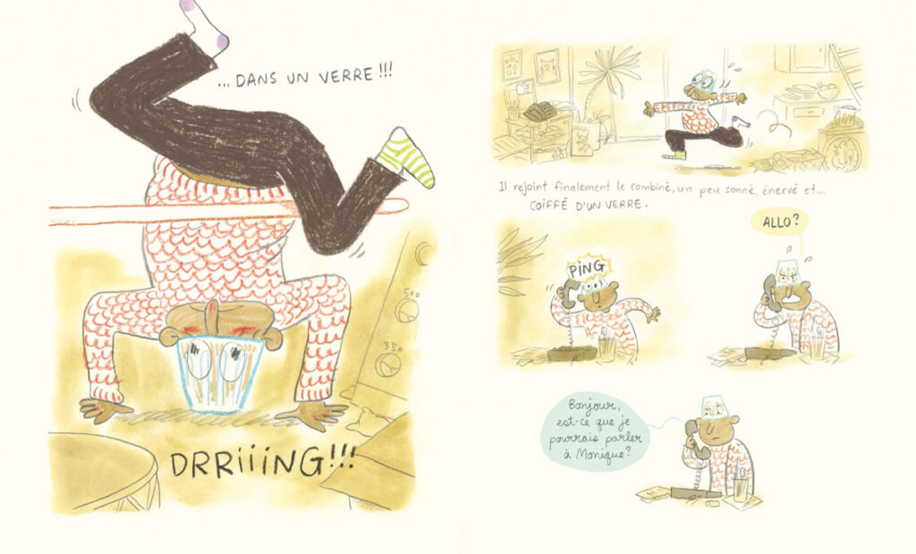 Incapable de s’en sortir par lui-même, Alphonse se résigne à demander l’aide de sa voisine Cécile, qui s’incline devant la tâche et demande du renfort à Isidore, puis à Marielle, puis au garage du village. Pas moyen de passer inaperçu ! Rapidement, tout un chacun est alerté de la malchance d’Alphonse et fait preuve d’une imagination sans bornes pour tenter de l’extirper de ce verre. »