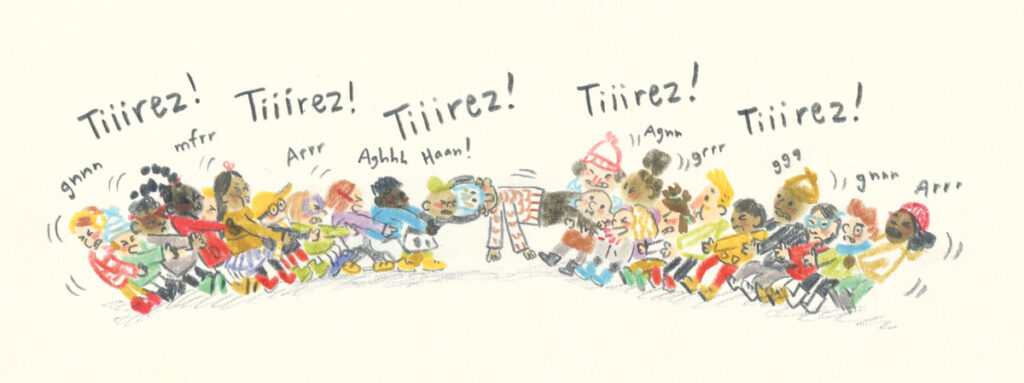 Incapable de s’en sortir par lui-même, Alphonse se résigne à demander l’aide de sa voisine Cécile, qui ensuite demande du renfort à Isidore, puis à Marielle, puis au garage du village. Pas moyen de passer inaperçu ! Rapidement, tout un chacun est alerté de la malchance d’Alphonse et fait preuve d’une imagination sans bornes pour tenter de l’extirper de ce verre. »