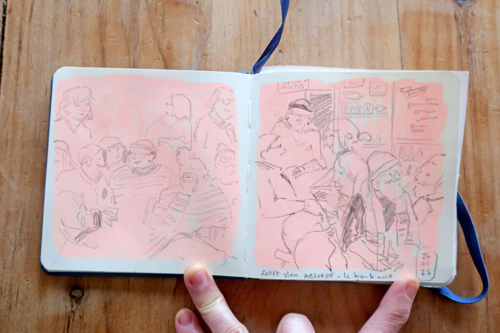 Au menu : Deuils de résidence de création, un coin musique, des algues, un slam, un damier abricot, de l’impro avec de la gouache, un beau projet, une entrevue et une église de nuit.